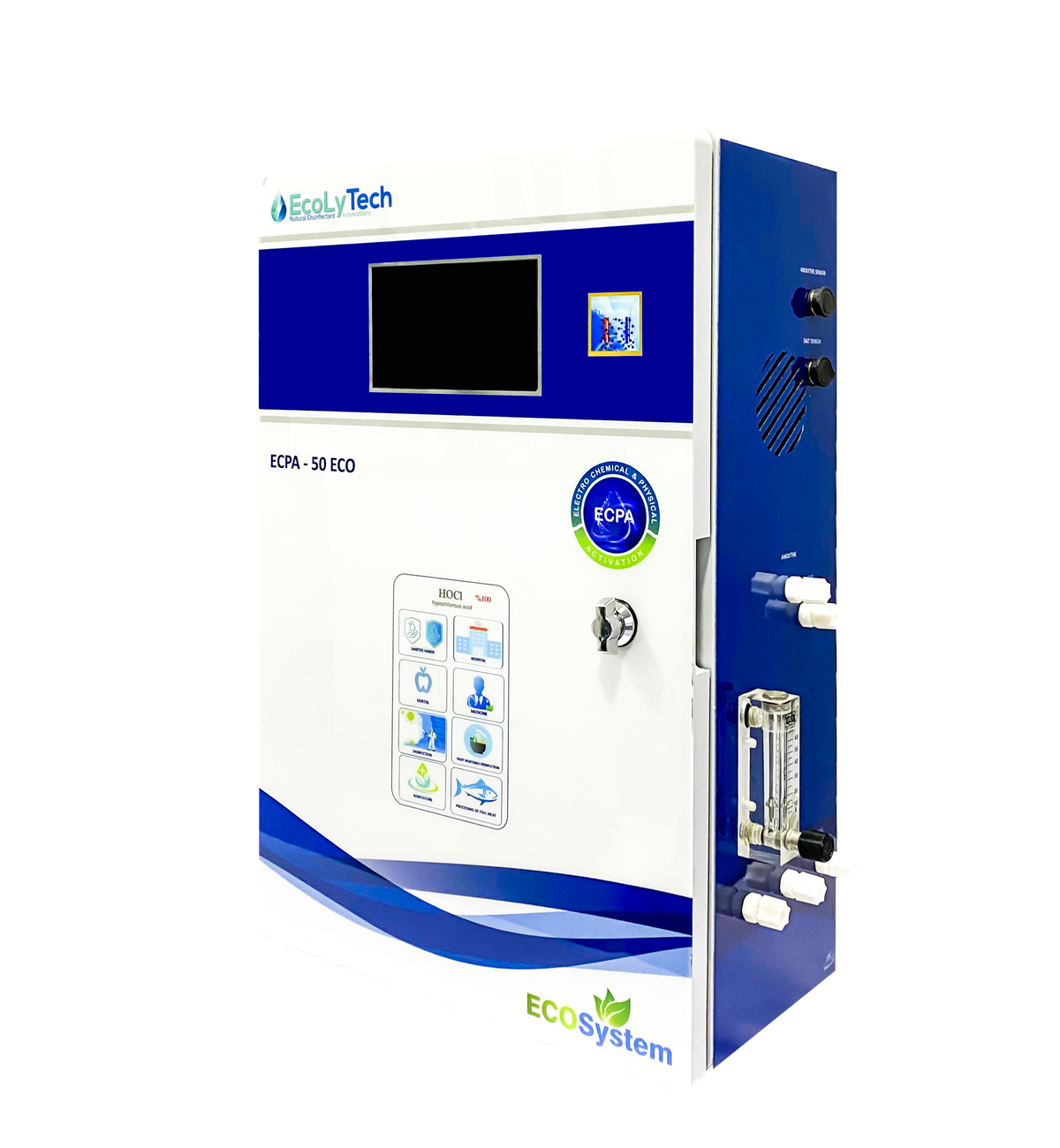 EcolyTech–ECPA sistemleri, çeşitli sektörlerde kullanılan zararlı kimyasal maddelerin yerini alabilecek, zararsız, çevre dostu, etkil, üretimi ve kullanımı kolay Hipokloröz asit dezenfektan ve Sodyum Hidroksil çözeltisini üretmektedir.